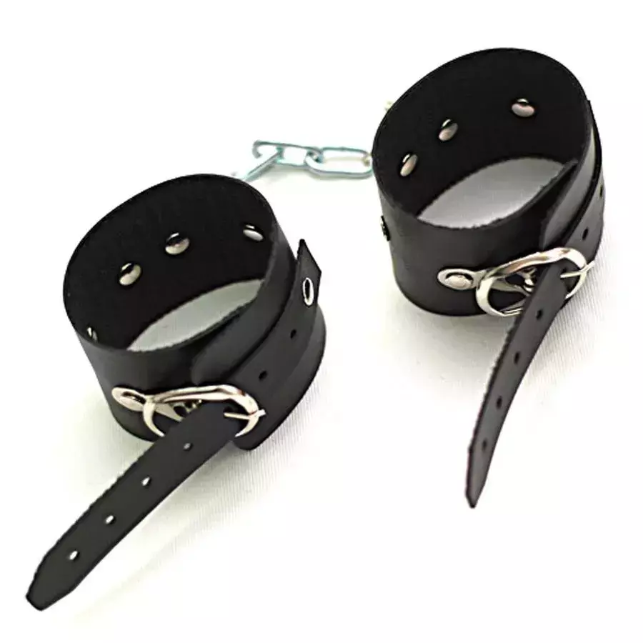 Envolva os punhos com as algemas e ajuste as cinco de forma confortável e segura. Conecte-se à corrente com os mosquetões e explore as possibilidades de submissão e dominação, sempre respeitando os limites e combinando as regras com seu parceiro(a).
